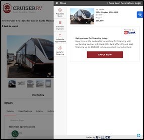 Through the RollickDR integration, consumers can estimate monthly payments through an embedded monthly payment calculator powered by U.S. Bank. Potential buyers can also apply for credit through the financial institution and receive a credit decision before arriving at the dealership.