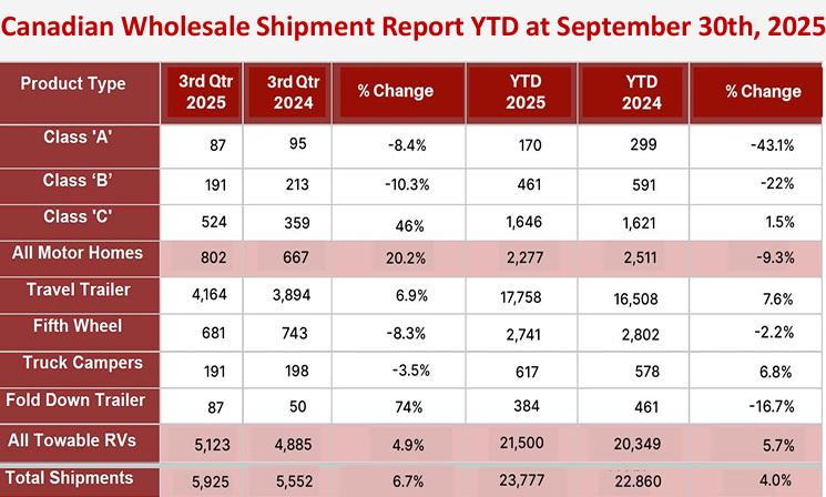 The Canadian Recreational Vehicle Association (CRVA) reported third-quarter RV wholesale shipments totaled 5,925, a 6.7% increase over the 5,552 RVs shipped during the third quarter of 2024.