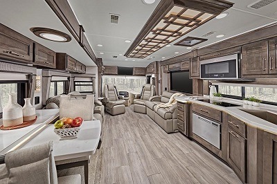 The manufacturer’s 2022 Anthem and Aspire lines feature Italian leather furniture throughout the coach. The brands’ wallboards, ceiling features, headboard, fireplace details and fascia are all new, EC stated, including updated options such as three recliners with footrests within the lines’ reclining sofa feature.