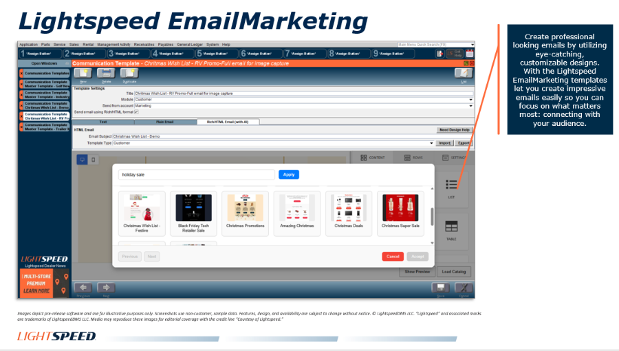 The newest addition to Lightspeed’s built-in marketing suite, EmailMarketing pairs with TextMarketing so dealers can plan and launch coordinated email + SMS campaigns without leaving the DMS. Dealers can create branded, rich-HTML emails with AI copywriting assistance, use pre-built templates tailored to common scenarios and segment audiences using Lightspeed data.