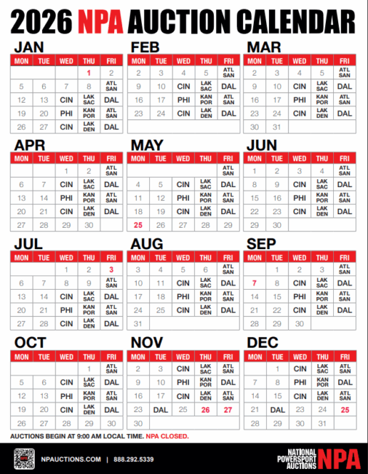 NPA said the 2026 schedule maintains the same structure dealers have come to rely upon. Auction start times continue at 9 a.m. local time in each market.