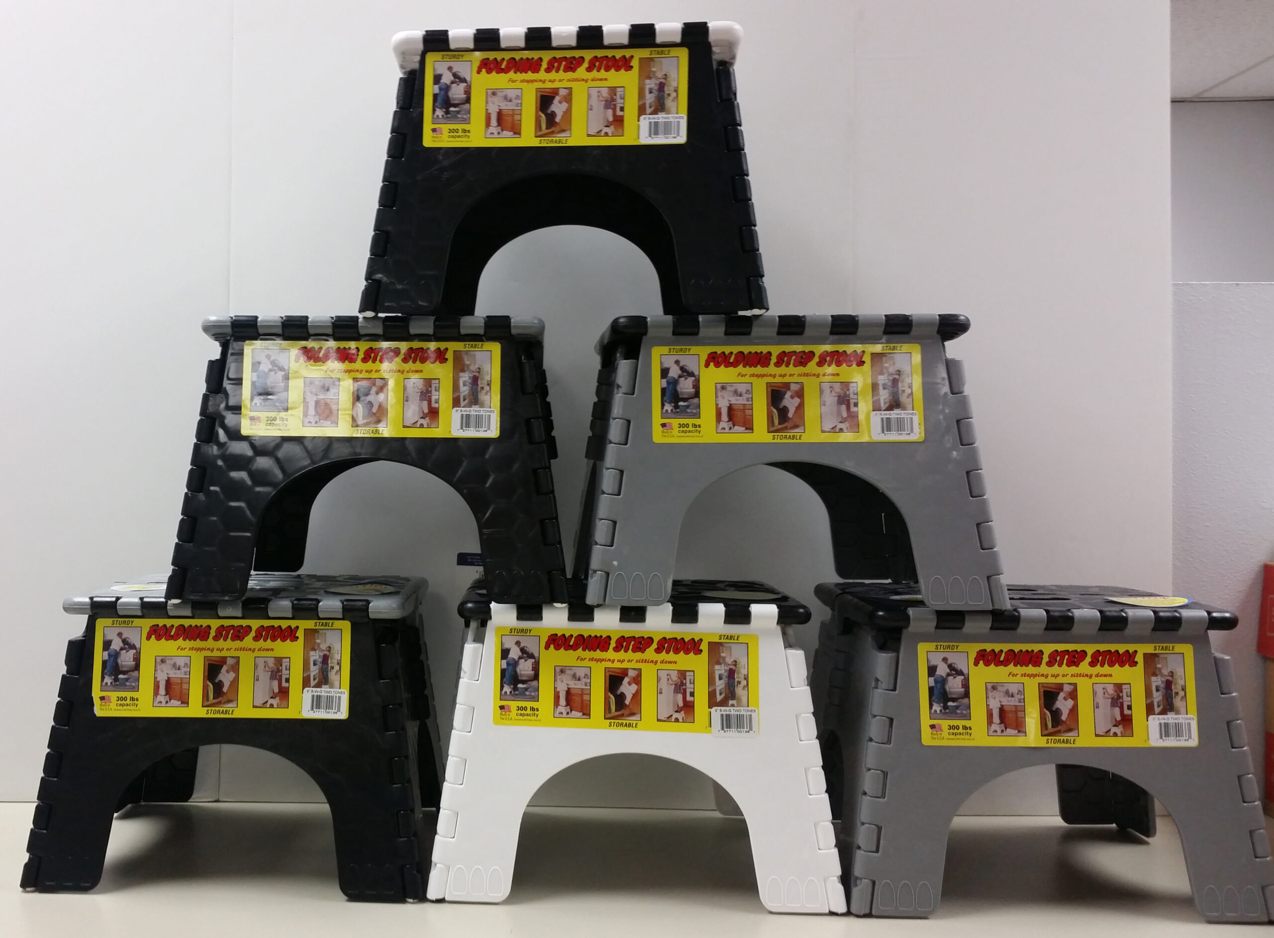 Order Direct from Supplier9" E-Z Foldz Folding Step Stool Black, White, Grey Two-Tone Assortment. Folds from a 9" high step stool with a 300 lbs. weight capacity to an easy-to-store 2" width.