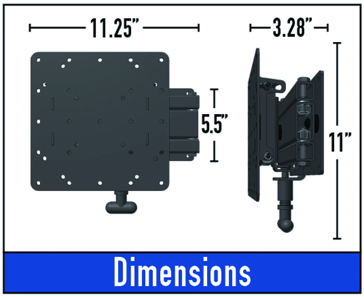 Extending swivel wall mount. Tilt and swivel adjustment, double joint extension are with locking in for safe travel.