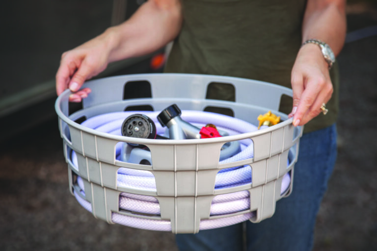 17” wide, 6-1/2” tall Holds up to 75 feet of hose Stores hose accessories Each hose end unwinds, bulk of hose remains in caddy