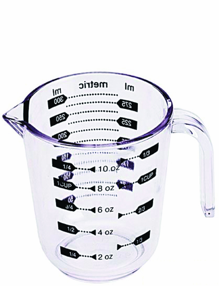 Clear measuring cup features easy-to read graduated markings for accurate measuring, an easy grip handle and a pour spout to minimize drips and spills. 1.5 cups.