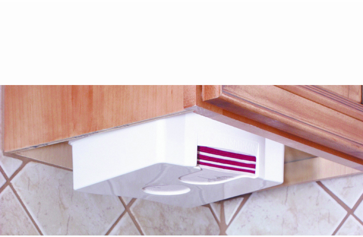 Made to fit under cabinet or shelf. Eliminates clutter. Easy to install and refill. Holds up to 50 standard household napkins. Durable plastic.