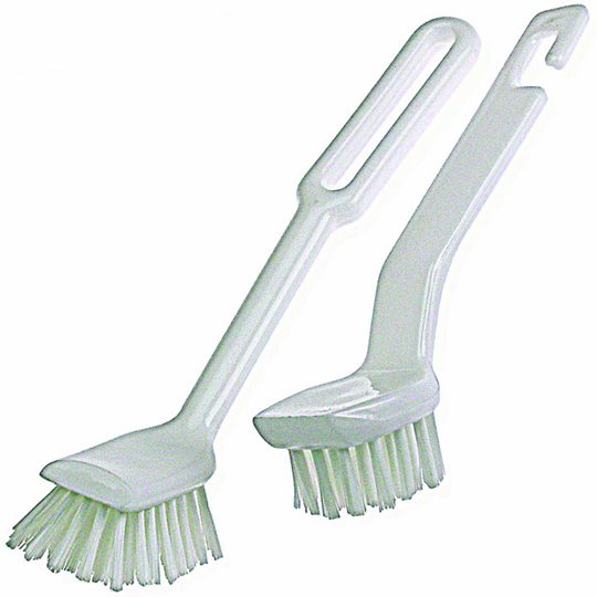 Durable brushes feature scraper heads to remove stuck on foods. Nylon and plastic.