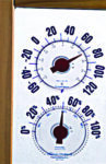 Read outdoor temperature and humidity at a glance. Easy to read numbers. Clear plastic dials adhere to glass.