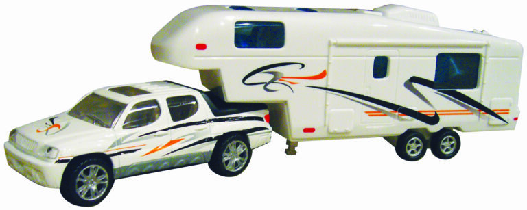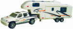 Pick-Up and 5th wheel die cast toy collectible. Free wheeling die cast metal and plastic replica of 5th wheel and Truck. Display box for collectors.