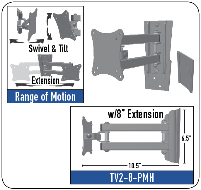 These mounts fit 15" - 19" flat panel TV's with VESA 75x75 or 100x100 mounting patterns and are all rated for 25lb. capacity. Two docking stations with each mount included.