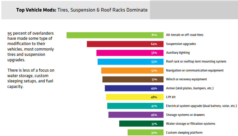 Nearly all overlanding vehicles have undergone modification, with 95% of overlanders reporting modifications. Tires and suspension upgrades are the most common modifications.